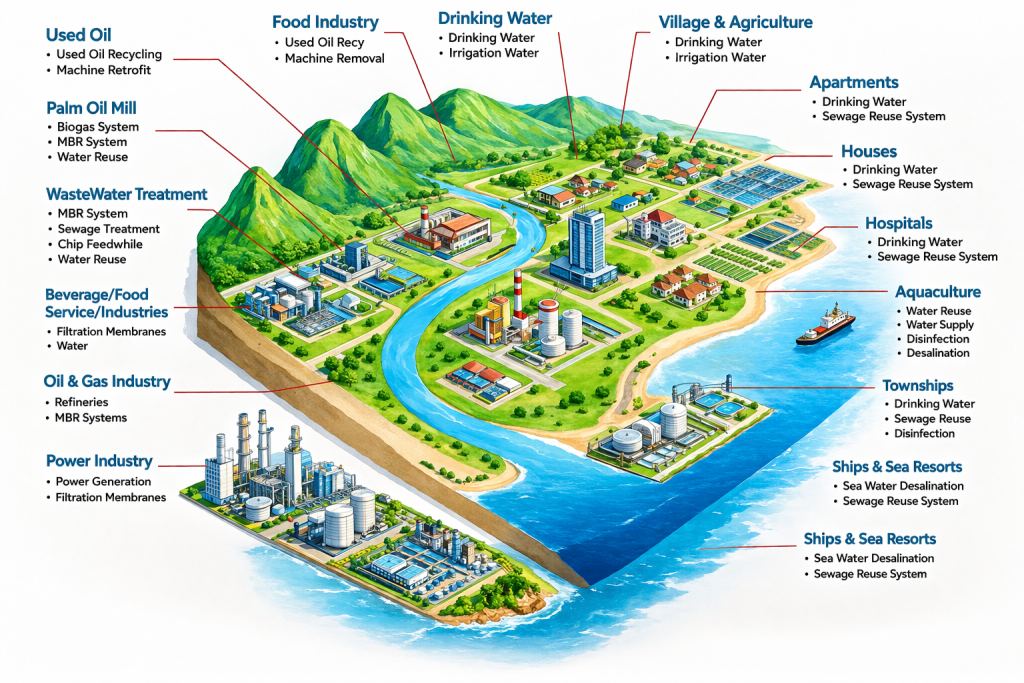 The Zeobina Ecosystem represents an integrated network where water, industry, communities, and nature coexist in balance. From industrial wastewater treatment and oil recycling to drinking water systems for villages, apartments, hospitals, and townships, every element is connected through sustainable water management. By enabling water reuse, desalination, filtration, and environmental engineering solutions, the ecosystem ensures that resources circulate efficiently, supporting industries, agriculture, and urban life while protecting the planet’s most vital resource.